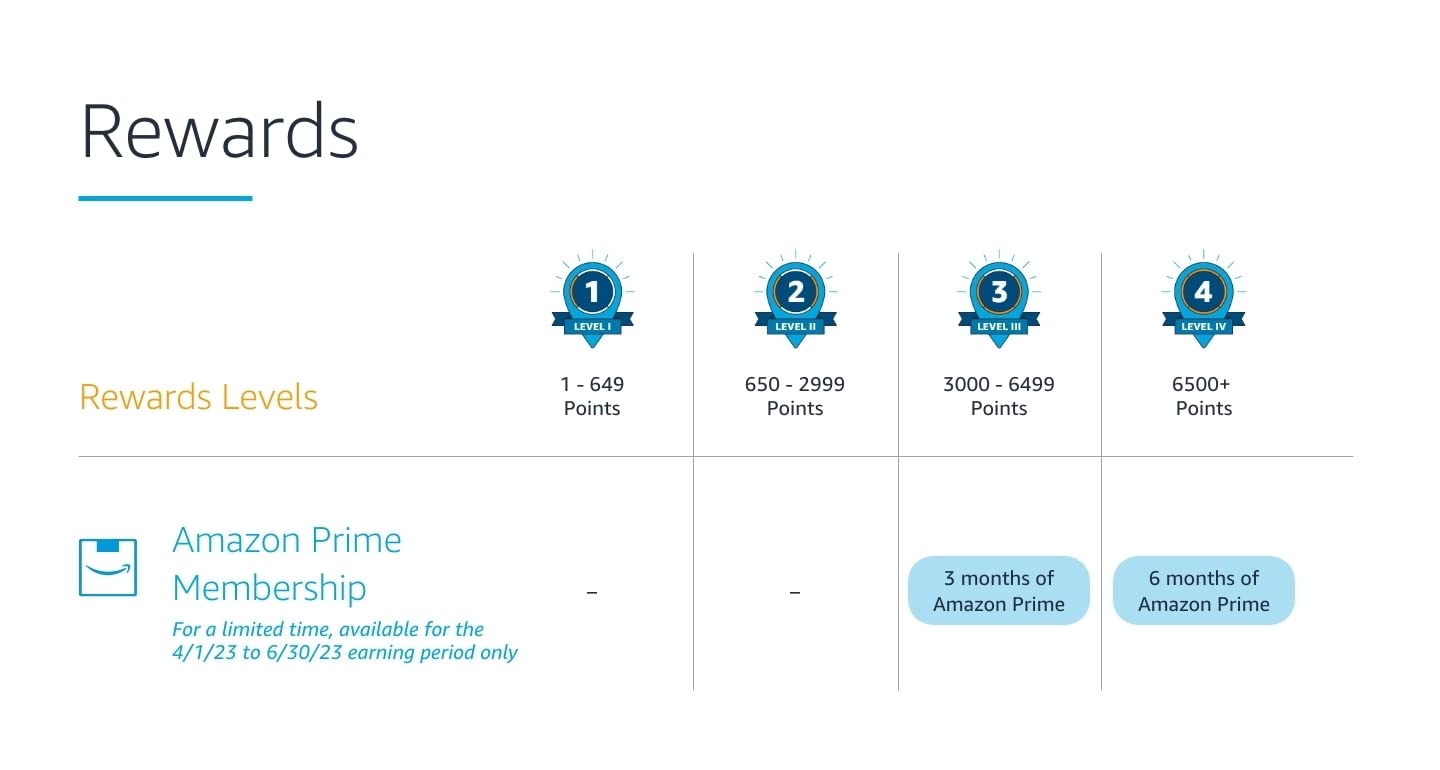 Prime members enjoy fast free delivery, easy returns, award-winning movies and TV shows, and exclusive deals. Now, Prime is available to qualifying delivery partners who reach Rewards Level 3 or Rewards Level 4 during the April to June Rewards earning period. Earn 3,000 points to unlock Rewards Level 3 and get three months of Prime, or earn 6,500 points to unlock Rewards Level 4 and get six months of Prime. The Prime reward can be earned during this three-month earning period in addition to existing rewards within these levels. View the Rewards chart, frequently asked questions, and Terms and Conditions below for details.