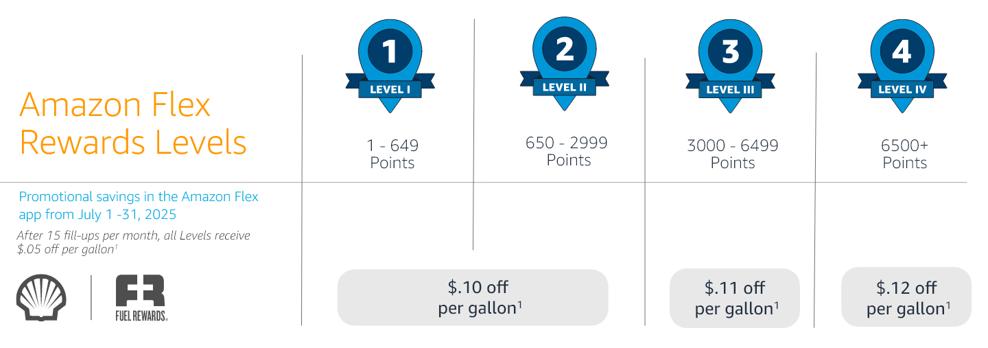 Your total fuel savings this July will depend on your current Amazon Flex Rewards level. Delivery partners at Rewards Levels 1 and 2 can save 10 cents per gallon, while those at Level 3 will receive 11 cents off per gallon. Delivery partners who have achieved Rewards Level 4 status can maximize their savings with 12 cents off per gallon. These discounts are available for up to 15 fill-ups during July at participating Shell locations.