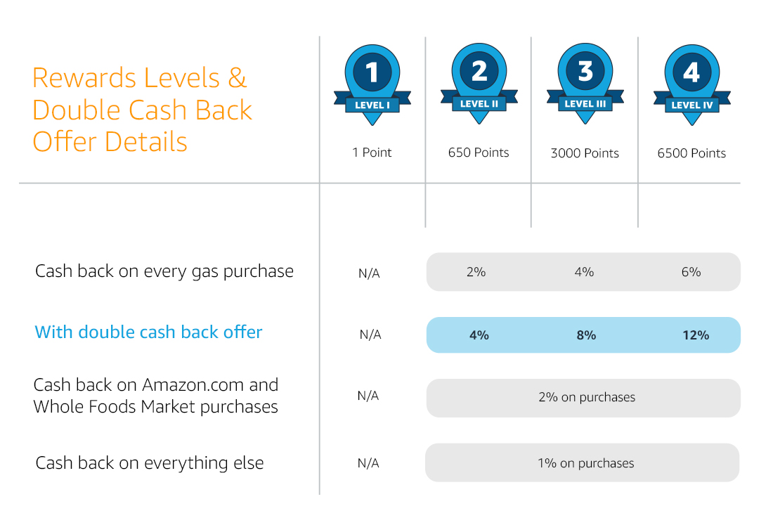 During this limited-time promotion, you’ll earn 12% cash back on gas if you are in rewards level 4, 8% for level 3, and 4% for level 2. The cash back will be automatically applied to your available balance. You’ll also continue to get 2% cash back on Amazon.com and Whole Foods and 1% cash back on everything else.