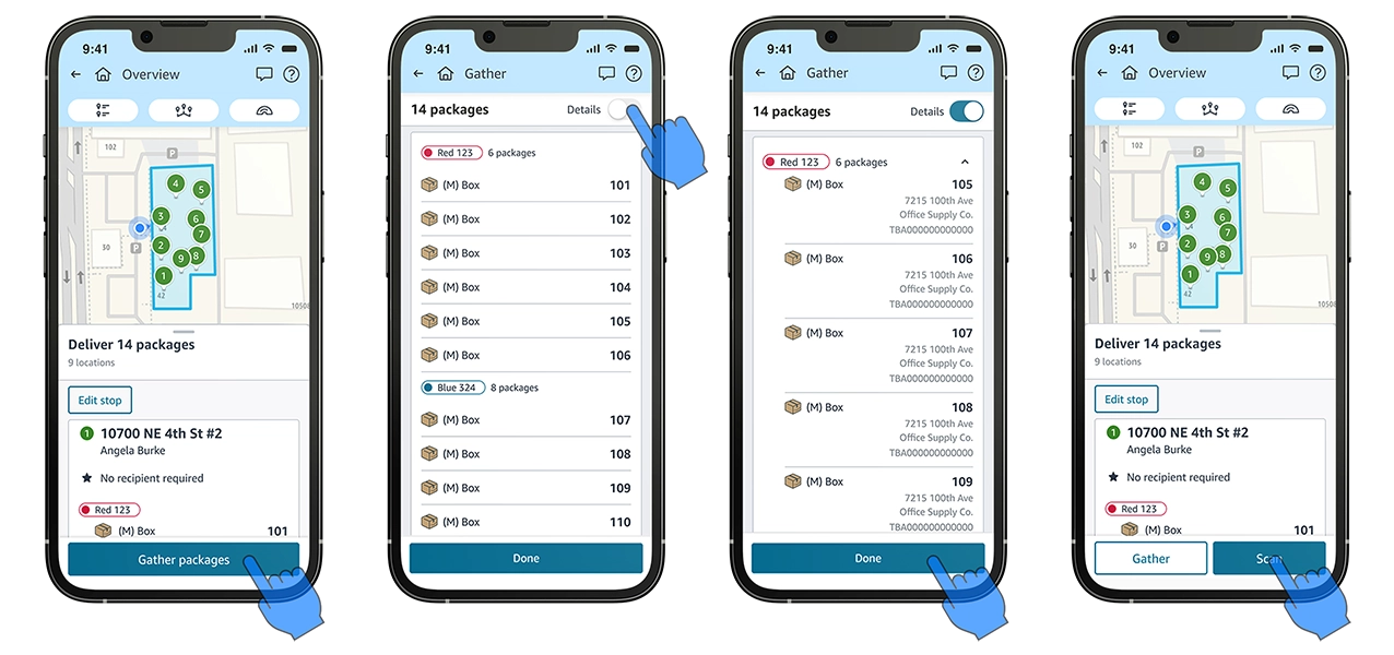 When delivering to a stop with multiple delivery locations, we know how important it is for you to be able to quickly and easily organize all the packages you need to deliver. The new Gather feature in the Amazon Flex app makes that easy to do on one screen. For any stop with multiple packages across two or more delivery locations, after you tap “I’ve parked” the Amazon Flex app will prompt you to “Gather packages”. You will see all packages grouped by location on a single screen. If you would like to review more information about any package such as the address, tap “Details” at the top of the Gather screen. Once you have all your packages organized, you can proceed to the delivery location confident you will not have to return to your vehicle for a missed package.