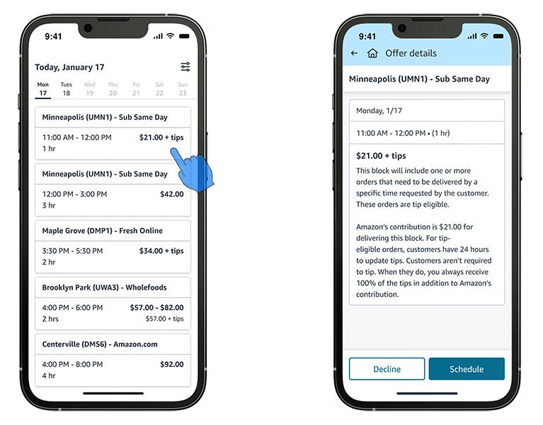 One-hour orders include the option for Amazon customers to leave a tip. As a result, Sub Same-Day blocks may include tip eligible and/or non-tip eligible orders. The Offers screen will always show clear, upfront guaranteed earnings and clarify if a block includes tip-eligible orders, so you can quickly decide if an offer is right for you. You will always receive 100% of your customer tips.