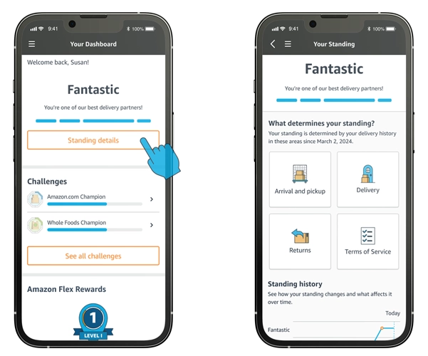 We know you care about being a successful delivery partner, and we want you to succeed as well. The Standings feature in the Amazon Flex app is an easy way to see information about your recent delivery history, and how you can continuously improve while delivering with Amazon Flex.